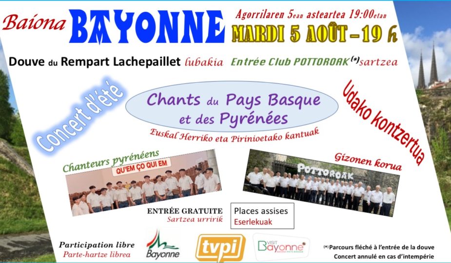 Mardi 5 août à 19 h, dans la douve du Rempart Lachepaillet de Bayonne, à l’entrée du Club Pottoroak, pour son 2ème concert d’été public en plein air, le chœur bayonnais a invité le groupe de chanteurs pyrénéens QU’EM ÇO QUI EM. Forts d’une douzaine de chanteurs, cet ensemble tarbais chantera en polyphonie essentiellement les Pyrénées de la Catalogne au Pays Basque (en occitan, catalan, bigourdan, béarnais et basque). Le chœur bayonnais, à son habitude, proposera des chants traditionnels à 4 voix a cappella et chants festifs d’ambiance de notre Pays Basque.